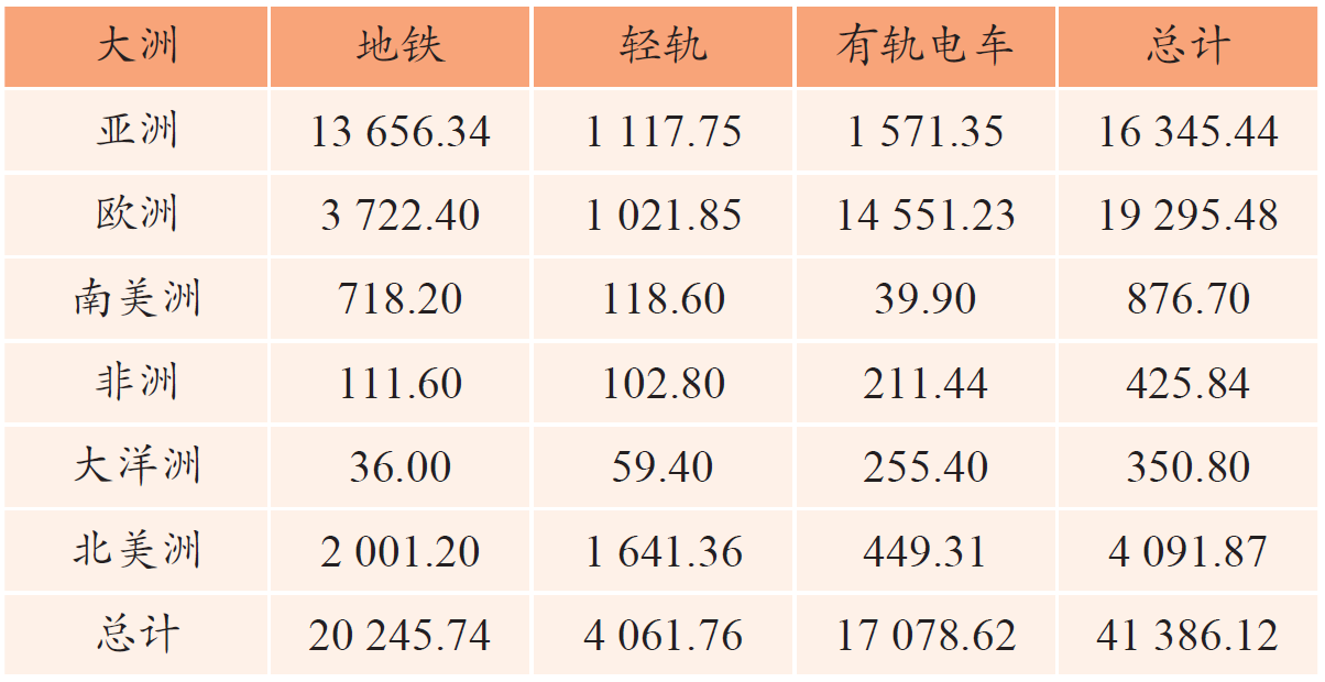 Gambar 1 menunjukkan skala keseluruhan angkutan kereta api perkotaan di seluruh benua besar di dunia (Catatan: Semua kota di Rusia diklasifikasikan ke dalam Eropa untuk perhitungan). Data menunjukkan bahwa kereta bawah tanah dan trem merupakan jenis angkutan kereta api perkotaan yang umum digunakan secara global, dan angkutan kereta api perkotaan global sebagian besar terkonsentrasi di Eurasia, dan kereta bawah tanah sebagian besar tersebar di negara-negara Asia.[1]