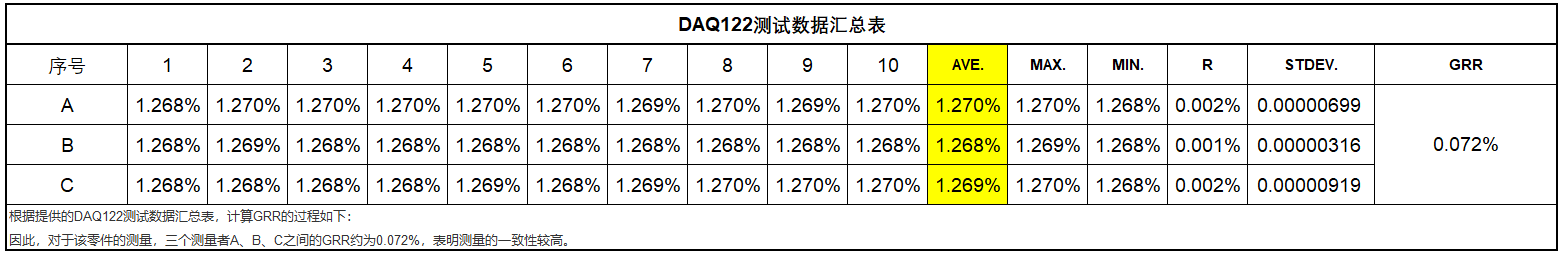 Untuk memastikan kartu akuisisi data yang dipilih memenuhi persyaratan, tim ME melakukan pengujian. Analisis menunjukkan bahwa kartu akuisisi data yang dipilih memiliki stabilitas yang sangat baik, dengan GRR sekitar 0,072% di antara tiga alat ukur A, B, dan C.