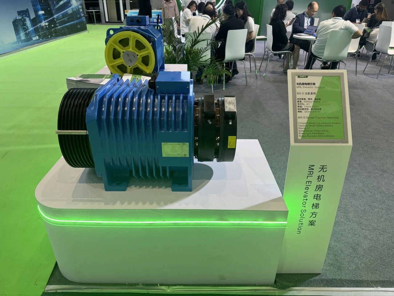 Selain itu, WEE ini juga memboyong mesin tipe barel seri WR-D terlaris di luar negeri. Desain yang ringkas secara efektif menekan tinggi produk, dan struktur yang ramping memenuhi kebutuhan proyek yang sangat menuntut di tingkat atas. Untuk WR-D, kapasitas maksimumnya adalah 1600kg dan kecepatan elevator tertinggi adalah 2,5m/s dengan dimensi sheave 400mm.